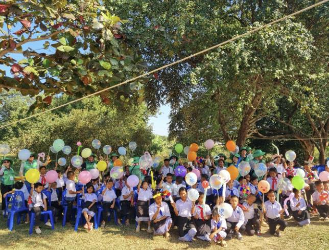 | ▲ 라오스 비엔티안 쌍텅구 쌈판나마을에서 현지 초등학생들과 함께 풍선아트 놀이 프로그램을 진행하는 모습 |