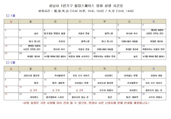 [무한뉴스=양현명 기자] 성남시는 오는 2월 28일까지 1인 가구 힐링 스페이스 커뮤니티 홀(중원구 둔촌대로 100 4층)에서 ‘추억의 할리우드 영화’를 총 120회 무료 상영한다.