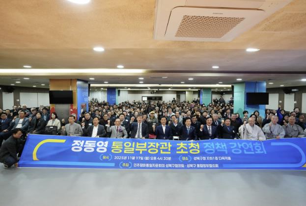 [무한뉴스=정승훈 기자] 민주평화통일자문회의 성북구협의회와 성북구 통합방위협의회가 17일 오후 성북구청 지하 다목적홀에서 정동영 통일부 장관을 초청해 특별 강연회를 개최했다. 이번 강연회는 지역 사회에서 평화통일 담론을 확산하고 지방정부 차원의 남북교류 협력 방안을 모색하기 위해 마련된 것으로, 지역 내 기관·단체 관계자들이 대거 참석하며 높은 관심을 보였다.