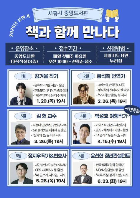 한편, 2026년 상반기 ‘책과 함께 만나다’는 1월부터 6월까지 매월 1회씩 운영한다. 참여 신청은 매월 첫째 주 화요일 오전 10시부터 시흥시도서관 누리집에서 선착순으로 진행된다. 강연에 대해 궁금한 사항은 중앙도서관으로 문의하면 된다.