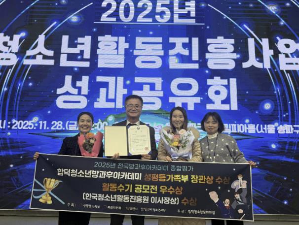 [무한뉴스=정민정 기자] (재)당진시청소년재단 소속 합덕청소년방과후아카데미와 송악청소년방과후아카데미가 2025년 11월 28일 방과후아카데미 사업 종합평가에서 최고 영예인‘최우수기관’으로 선정되는 쾌거를 이루었다. 이와 더불어 성평등가족부 장관상과 특별상(한국청소년활동진흥원이사장)을 수상하며 그간의 노력을 인정받았다.