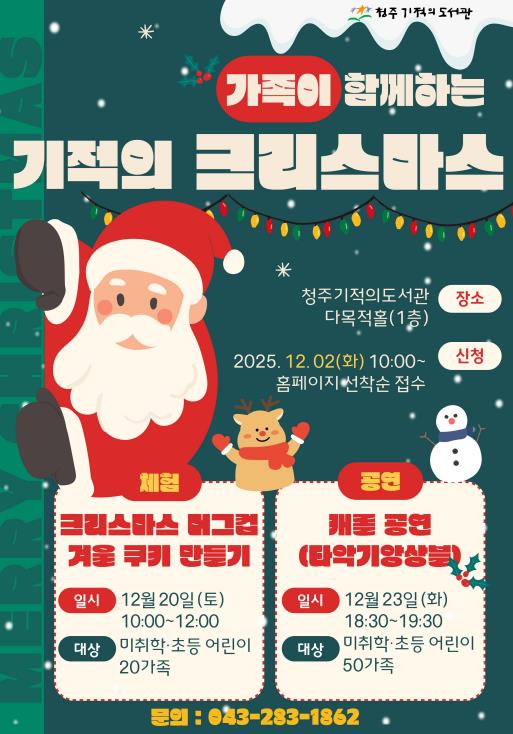 [무한뉴스=정민정 기자] 청주기적의도서관은 오는 12월 20일과 23일 청주기적의도서관 다목적홀(1층)에서 ‘가족이 함께하는 기적의 크리스마스’ 행사를 개최한다.
