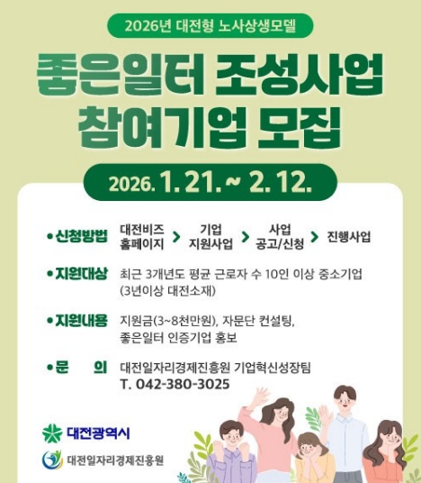 [무한뉴스=정민정 기자] 대전시는 1월 21일부터 2월 12일까지 대전형 노사상생 모델‘2026년 좋은 일터 조성사업’에 참여할 12개 기업을 공개 모집한다.