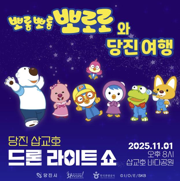 [무한뉴스=정민정 기자] 당진시는 오는 11월 1일 삽교호관광지 바다공원 일원에서 ‘뽀롱뽀롱 뽀로로와 당진 여행’을 주제로 2025 당진 삽교호 드론 라이트 쇼의 화려한 폐막 공연을 개최한다고 27일 밝혔다.