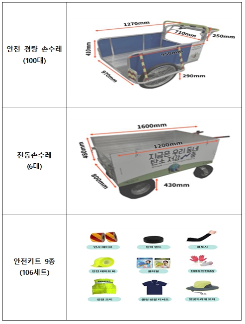 물품은 시 16개 구·군의 신청을 받아 ▲경량손수레와 안전키트는 폐지수거어르신에게, ▲전동손수레는 우리동네 사회가치경영(ESG) 센터 등으로 순차적으로 전달될 예정이다.