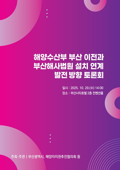 [무한뉴스=최진수 기자] 부산시는 오늘(29일) 오후 2시, 부산시티호텔 2층 컨벤션홀에서 '해양수산부 부산 이전과 부산해사법원 설치 연계 발전 방향 토론회'를 개최한다고 밝혔다.