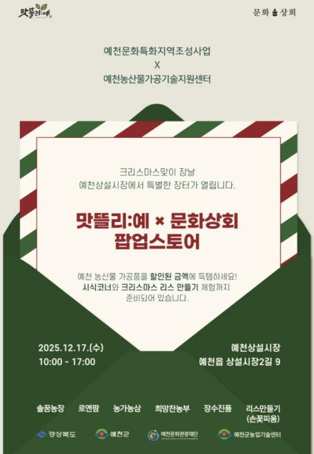 [무한뉴스=최진수 기자] 예천군과 예천문화관광재단은 17일, 예천상설시장 ‘문화상회’에서 크리스마스를 맞아 ‘문화상회 X 맛뜰리:예’ 프로그램을 개최한다.