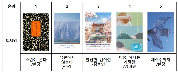 『작별하지 않는다』, 『채식주의자』 등 한강 작가의 작품이 다수 상위권에 오르며 꾸준한 독서 흐름을 보였다.