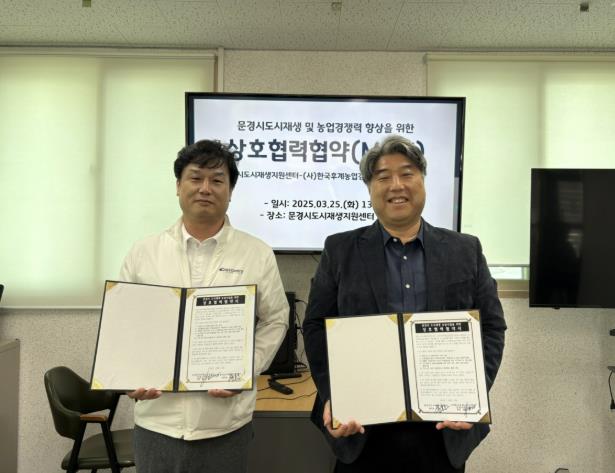 [무한뉴스=최진수 기자] 문경시도시재생지원센터는 3월 25일 (사)한국후계농업경영인문경시연합회와 우호적인 관계를 형성하고 지역 간 네트워크를 구축하여 상호 간 사업에 대한 적극적 참여를 위해 협력 협약을 체결하였다.