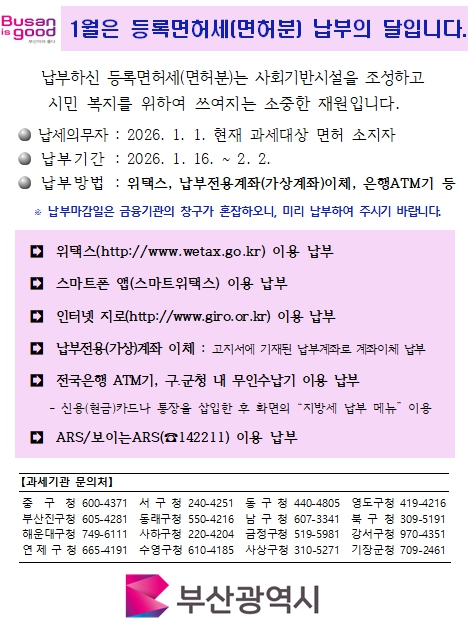 [무한뉴스=최진수 기자] 부산시는 2026년 정기분 등록면허세(면허분) 총 43만여 건, 142억 원을 부과했다고 밝혔다.