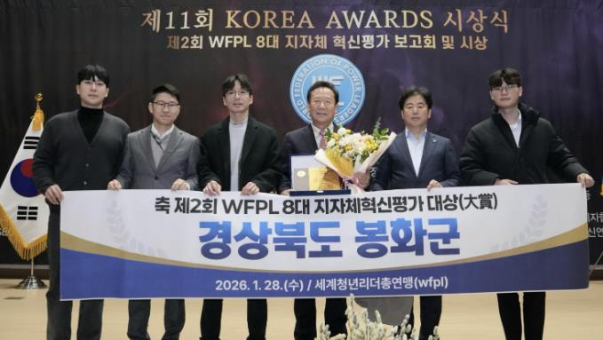 [무한뉴스=최진수 기자] 봉화군이 세계청년리더총연맹(WFPL) 부설 지자체혁신평가위원회(GEC)가 주관한 ‘제2회 WFPL 8대 지자체 혁신평가’에서 기관 부문 최고 영예인 ‘대상(大賞)’을 수상했다.