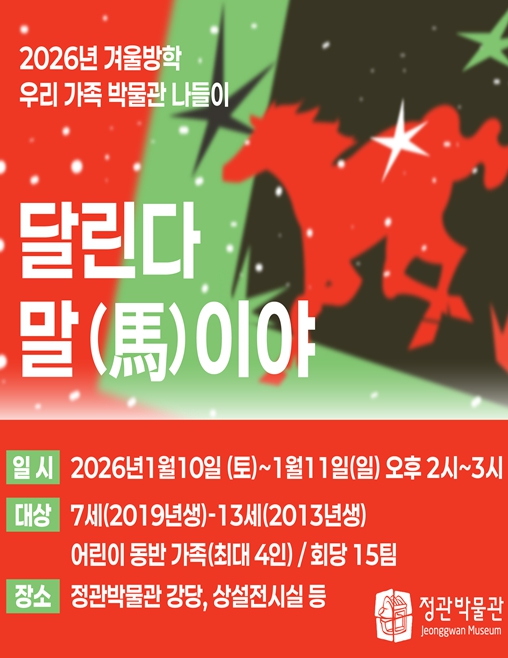 [무한뉴스=최진수 기자] 부산시립박물관 소속 정관박물관은 다가오는 2026년 병오년(丙午年) '붉은 말의 해'를 맞아, 내년 1월 10일부터 11일 양일간 겨울방학 가족 교육프로그램 '겨울방학 우리 가족 박물관 나들이-달린다 말(馬)이야'를 운영한다고 밝혔다.