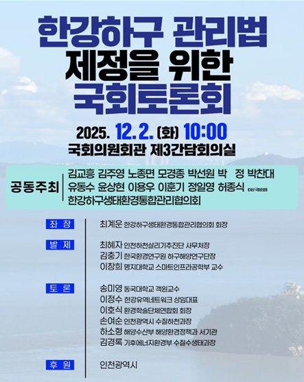 공동 주최 의원들은 “한강하구는 인천과 경기, 나아가 대한민국의 소중한 자연유산이자 미래 자산”이라며 “이번 토론회를 계기로 법적 사각지대에 놓인 한강하구의 체계적인 관리 시스템을 구축하고, 통합 관리를 위한 법적 근거를 마련하는 데 국회 차원의 노력을 다하겠다”고 밝혔다.