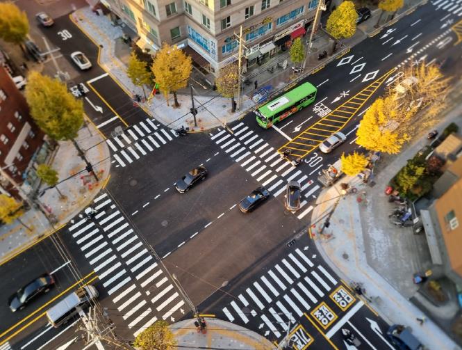 이에 구는 올해 9월 29일부터 공사를 시작해 기존의 ‘ㄷ’자 횡단보도에서 ‘ㅁ’자 횡단보도로 정비했다. 11월 12일에는 동시 보행신호를 개통하고, 이어 21일에는 인근 차도 포장과 보도 정비를 완료했다.