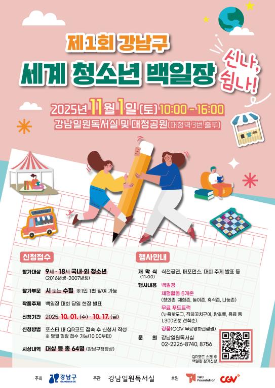 [무한뉴스=박노신 기자] 꿈이 모이는 도시, 미래를 그리는 강남구가 오는 11월 1일 오전 10시부터 오후 4시까지 강남일원독서실과 대청공원 일대에서 ‘제1회 강남구 세계청소년백일장 신나, 쉼나!’를 개최한다. 이 행사는 국내‧외 국적 청소년이 함께하는 전국 최초의 기초지자체 주관 백일장으로, 다문화 시대와 K-컬처 확산 흐름에 발맞춘 문학축제다.