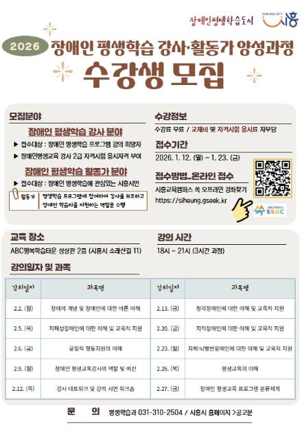 [무한뉴스=정승훈 기자] 시흥시는 오는 1월 23일까지 ‘2026년 장애인 평생학습 전문 강사와 활동가 양성 과정’ 수강생을 모집한다.