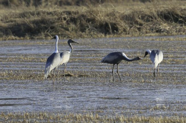 | ▲ 새끼에게 먹이를 먹이는 재두루미 가족 |