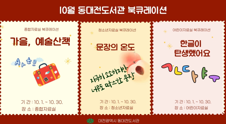 [무한뉴스=정민정 기자] 동대전도서관은 가을 독서의 계절을 맞아 10월 한 달간 연령별 맞춤 주제 북큐레이션 전시를 운영한다고 10일 밝혔다.