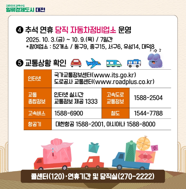 장거리 운행 중 고장에 대비해 동구·중구·서구·유성구·대덕구에서 총 52개 당직 자동차정비업소가 운영되며, 운수종사자를 대상으로 한 교통안전·친절교육과 교통시설물 사전 점검도 이미 완료됐다.