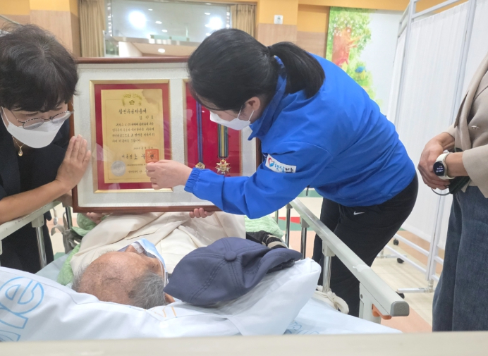 [무한뉴스=정민정 기자] (사)햇살마루 재단과 추풍령면사무소는 17일 충북 영동군 감고을 요양병원에 방문하여 건강 상태가 좋지 않은 추풍령면 무연고 참전유공자 김신호(만 91세) 씨를 찾아, 유공자증과 훈장을 고급 액자로 제작해 전달해 주는 전달식을 가졌다.