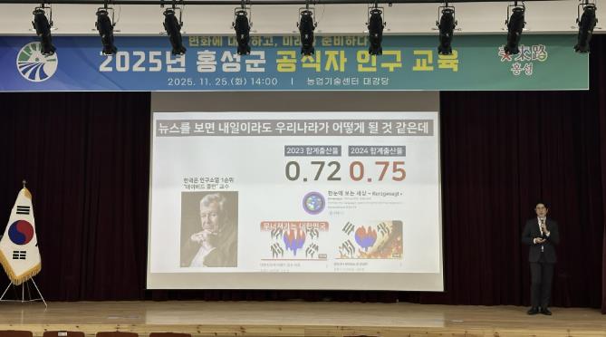 [무한뉴스=정민정 기자] 홍성군은 지난 25일 농업기술센터 대강당에서 전 직원을 대상으로 ‘2025년 홍성군 직원 인구교육’을 실시하고, 인구감소에 대응하기 위한 공직사회의 인식 제고와 정책 역량 강화를 다졌다고 밝혔다.