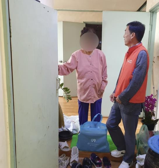 | ▲ 온양2동 행복키움추진단이 독거노인 가정을 방문해 영양보충식품을 전달하는 모습 |
