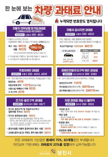 [무한뉴스=정민정 기자] 당진시는 차량 관련 과태료 정보를 한눈에 확인할 수 있는‘차량 과태료 통합 안내문’을 제작해 관내 아파트 단지와 각 행정복지센터에 비치했다고 15일 밝혔다.