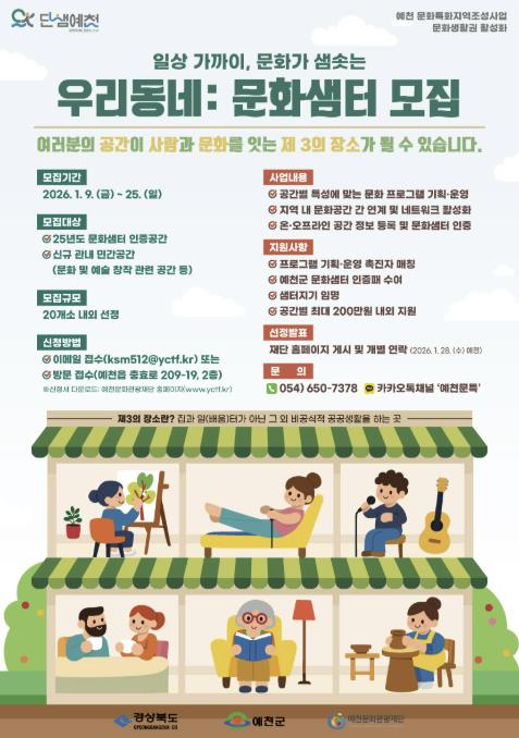 [무한뉴스=최진수 기자] 예천군과 (재)예천문화관광재단은 ‘문화특화지역 조성사업’의 일환으로 문화생활권 조성을 위한 ‘우리동네:문화샘터’ 2기 참여자를 9일부터 25일까지 모집한다.