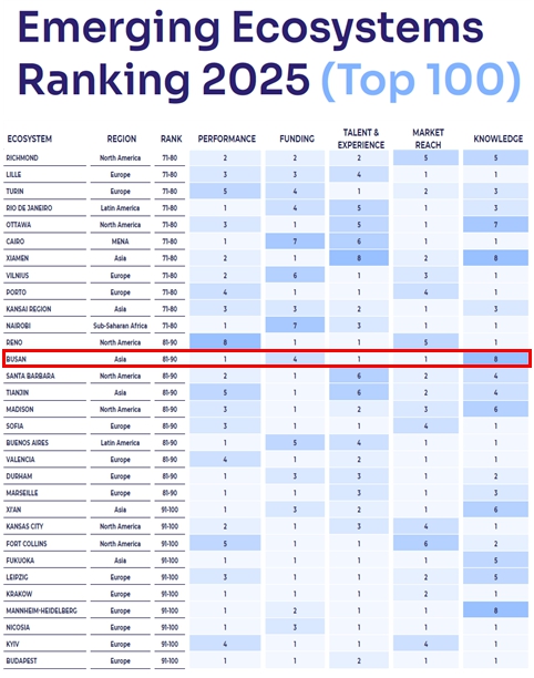 | ▲ 스타트업지놈(StartupGenome)신흥창업도시순위(70~100위) |