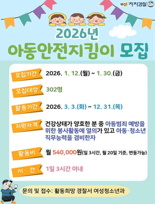 [무한뉴스=최진수 기자] 부산시 자치경찰위원회는 부산경찰청과 함께 오는 1월 12일부터 1월 30일까지 '2026년 아동안전지킴이'를 모집한다고 밝혔다.