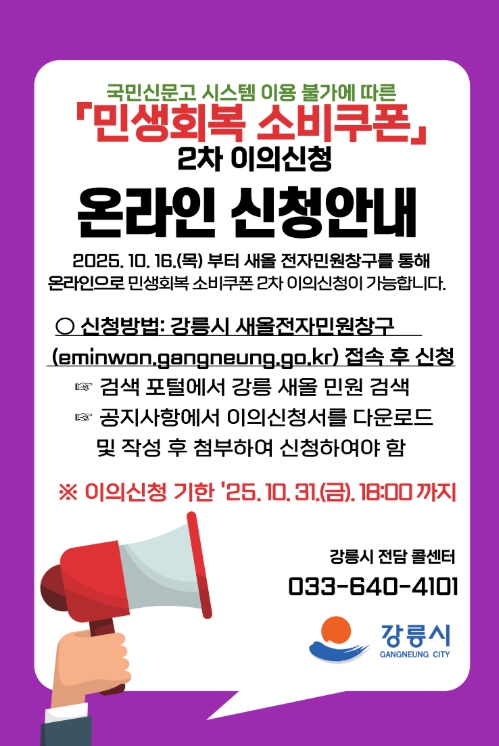 이의신청 시에는 ‘민생회복 소비쿠폰 2차 이의신청서’를 작성해 첨부해야 하며, 신청서는 강릉시 홈페이지 공지사항 및 새올전자민원창구 공지사항을 통해 내려받을 수 있고. 처리가 가능한 주요 이의신청 사유는 ▲건강보험료 변동 ▲자녀 부양관계 변경 ▲체류자격 변경 등이다.