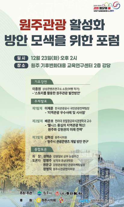 원강수 원주시장은 “이번 포럼에서 제시되는 창의적이고 심도 있는 제안들이 원주만의 차별화된 관광 경쟁력을 깨우는 계기가 되길 기대한다”라고 말했다.