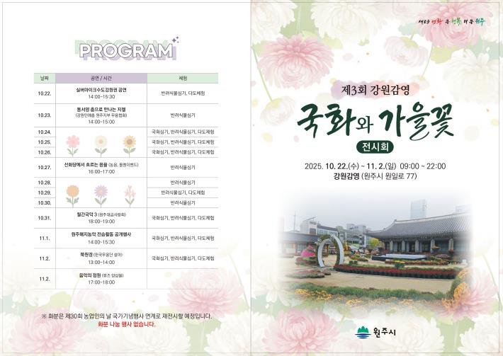 이에 더해 11월 1일 오후 2시에는 가을꽃으로 물든 강원감영을 배경으로 강원특별자치도 무형유산 원주매지농악 전승활동 공개행사가 펼쳐져 관람객들에게 색다른 볼거리를 선사할 예정이다.
