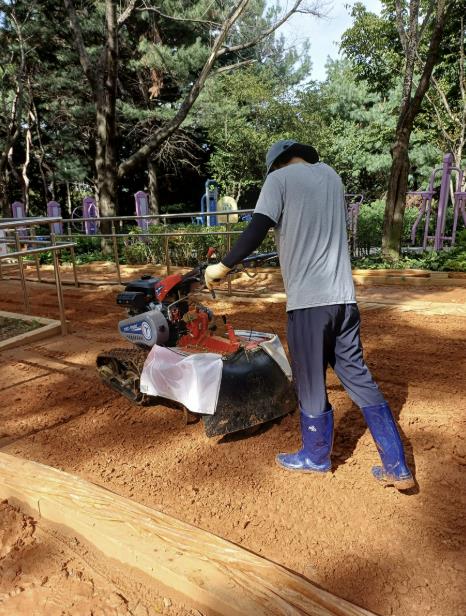 | ▲ 성남시 황송공원 내 황톳길에서 로터리 작업(흙 뒤집기)을 진행하고 있다 |