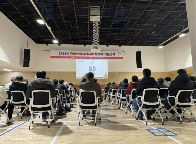 이번 교육에서는 ▲2026년 장애인일자리사업 공통사항 ▲근무기간 및 근무시간 ▲급여 체계 안내 ▲휴가·병가·특별휴가·공가 등 근태 관리 ▲직장 내 기본 에티켓 ▲민간일자리 취업 연계 지원 등 사업 전반에 대한 안내와 함께, 근무중 발생할 수 있는 안전사고 예방 및 기본 안전수칙에 대한 설명도 함께 진행됐다.