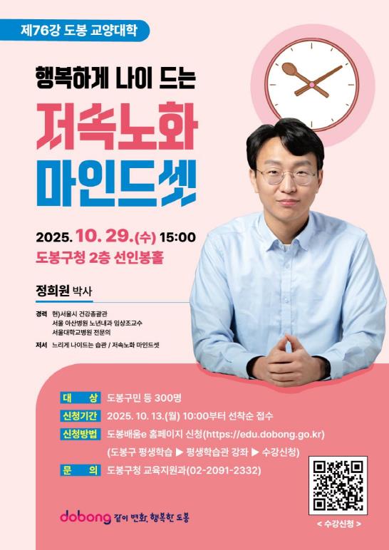 [무한뉴스=정승훈 기자] 서울 도봉구가 10월 13일 오전 10시부터 ‘저속노화 마인드셋’ 특강 참여자를 모집한다.
