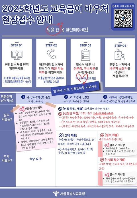[무한뉴스=정승훈 기자] 서울특별시교육청은 2025년 12월 2일부터 12월 12일까지, 2025학년도 교육급여 바우처 미신청자 중 온라인 신청이 어려운 대상을 위해 한시적 현장 접수를 운영한다고 밝혔다.