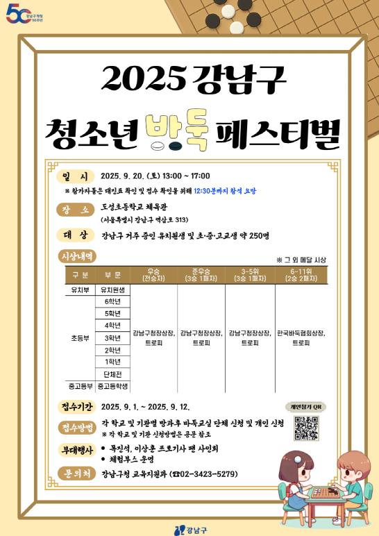 [무한뉴스=박노신 기자] 꿈이 모이는 도시, 미래를 그리는 강남구가 오는 9월 20일 오후 1시부터 5시까지 서울도성초등학교 체육관(역삼로 313)에서 ‘2025 청소년 바둑 페스티벌’을 개최한다.