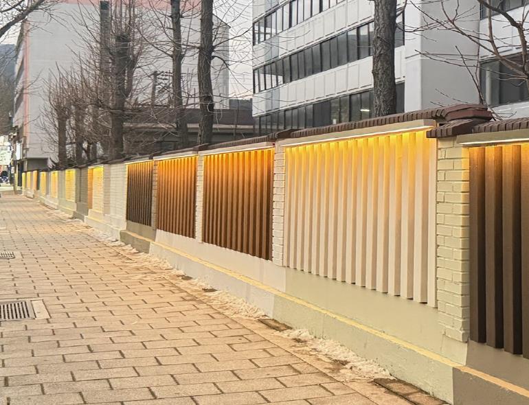 담장 상단에는 은은한 조명 라인을 설치해 보행자의 시인성을 높이고 편안한 보행환경을 조성했다.