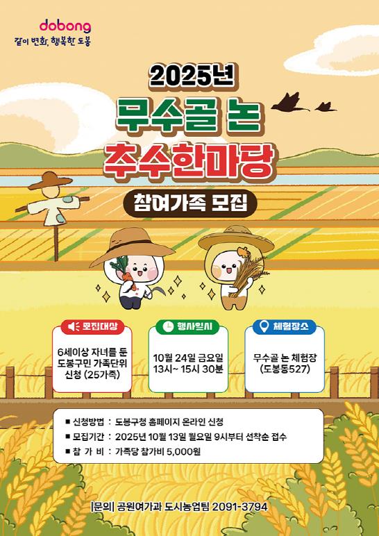 [무한뉴스=정승훈 기자] 서울 도봉구가 오는 10월 24일 무수골 친환경 논 체험장(도봉동 527)에서 ‘무수골 논 추수한마당’ 행사를 개최한다.