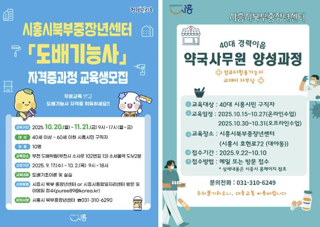 특히 10월에는 도배기능사 자격증 과정과 약국 사무원 양성 과정을 개설해 참여자를 모집하며, 참여 신청은 9월 17일부터 10월 2일까지 시흥시북부중장년센터(시흥시 호현로 72)에 방문하거나 전자우편을 통해서도 가능하다. 교육별 장소 및 기간이 다르므로 교육 관련 자세한 사항은 시흥시청 누리집의 고시공고 게시판에서 확인하면 된다.