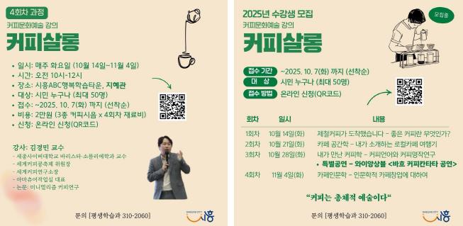 [무한뉴스=정승훈 기자] 시흥시는 민간주도형 지역축제 지원사업인 ‘2025년 시흥시 지역특화 관광축제 지원사업’에 선정된 ‘세계 커피콩 축제’의 사전 연계 프로그램으로 커피문화예술 특강 ‘커피살롱’을 오는 10월 14일부터 11월 4일까지 시흥ABC행복학습타운 지혜관에서 총 4회에 걸쳐 진행한다.