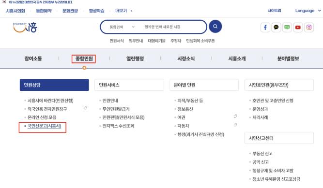 국민신문고 시스템 정상화까지 4주 이상 소요될 것으로 예상됨에 따라, 시는 이 기간에 누리집을 통한 민원 신청을 병행한다. 민원 신청은 시흥시청 누리집 상단 메뉴의 ‘종합민원 → 국민신문고(시흥시)’ 항목에서 가능하다.