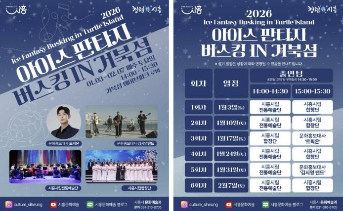 [무한뉴스=정승훈 기자] 시흥시는 지난 연말에 진행된 ‘2025 시흥 사운드 오브 윈터’의 열기를 잇는 후속 문화예술 프로그램으로, 겨울철 거북섬을 찾는 시민과 관광객에게 풍성한 즐길 거리를 제공하고자 ‘2026 아이스 판타지 버스킹 인 거북섬’을 운영한다.