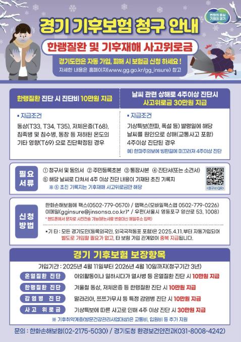 한편 ‘경기 기후보험’은 한랭질환 외에도 여름철 온열질환이나 말라리아, 쯔쯔가무시와 같은 특정 감염병 진단 시에도 각각 10만 원의 진단비를 지원한다. 상세한 문의는 한화손해보험(02-2175-5030)을 통해 가능하다.