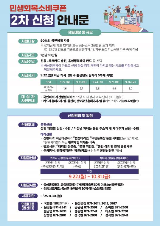 [무한뉴스=정민정 기자] 음성군은 이달 22일부터 2차 민생회복 소비쿠폰을 지급한다.