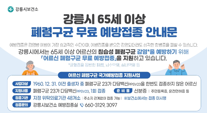 [무한뉴스=정민정 기자] 강릉시는 기온이 급격히 떨어지는 겨울철을 앞두고 면역력이 저하된 65세 이상 어르신들의 폐렴구균 예방접종률이 저조함에 따라, 중증 감염병 예방을 위한 시민들의 적극적인 접종 참여를 당부했다.