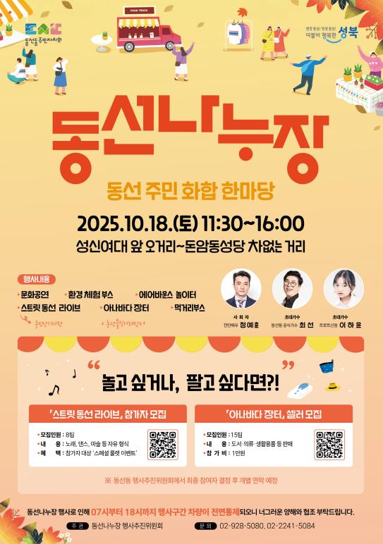 [무한뉴스=정승훈 기자] 서울 성북구가 오는 10월 18일 오전 11시 30분부터 오후 4시까지 성신여대 앞 오거리에서 돈암동성당 구간까지 이어지는 도로에서 ‘2025년 차 없는 거리 동선나누장’을 개최한다.