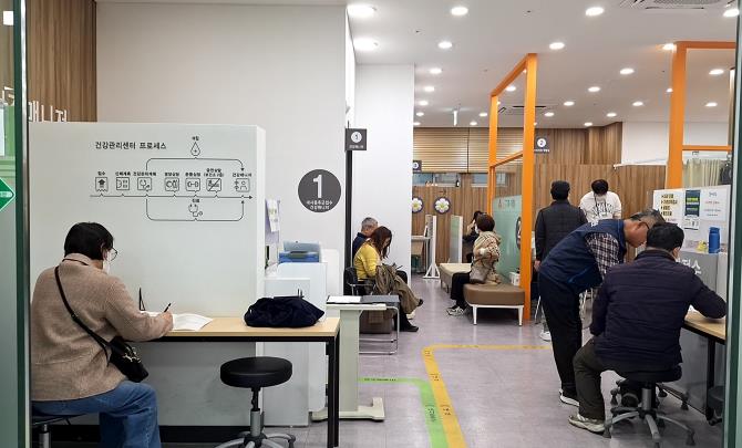| ▲ 구로구보건소 건강관리센터를 방문한 주민들이 대사증후군 검진과 건강상담을 위해 대기하거나 설문지를 작성하고 있다. |