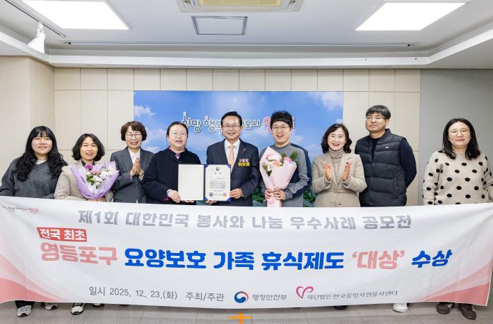 [무한뉴스=정승훈 기자] 영등포구가 행정안전부 주최 2025년 제1회 대한민국 봉사와 나눔 우수사례 공모전에서 ‘요양보호가족 휴식제도’로 ‘행정안전부 장관상(대상)’을 수상했다고 밝혔다. 공공부문 자치구 가운데 유일한 수상으로, 지역 기반 돌봄 정책의 우수성을 전국적으로 인정받았다.